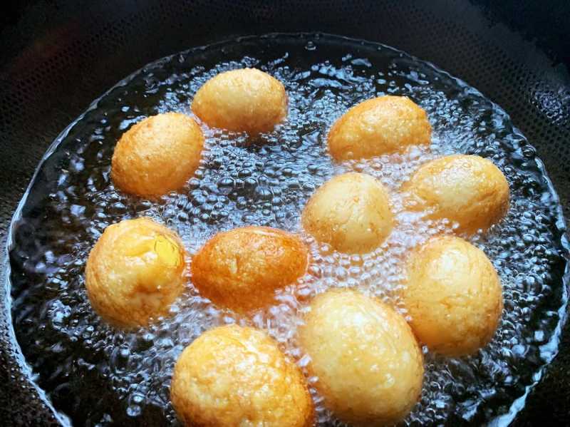 3、起锅烧油,等油温6-7成热的时候,依次下入鸡蛋,小心操作,避免热油溅出,如果鸡蛋过于多的话,可以分两次炸制,炸制色泽金黄,虎皮起皱为止。