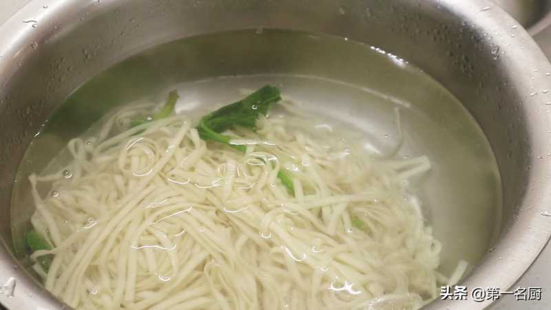 7.15秒后即可捞出,放入凉水盆中过凉,再控去水分,放入大碗中。
