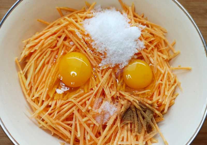 1、把红薯削去外皮,擦成细丝,打入两个鸡蛋,根据个人的口味,加入2克盐,10克白糖,适量十三香,白胡椒粉,用筷子搅拌均匀。