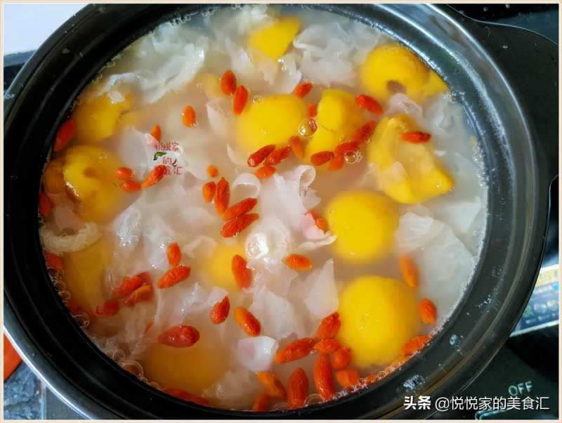 【第三步】:时间到了之后把枇杷放入锅中煮5分钟,然后再把枸杞和冰糖放入锅中搅拌均匀,