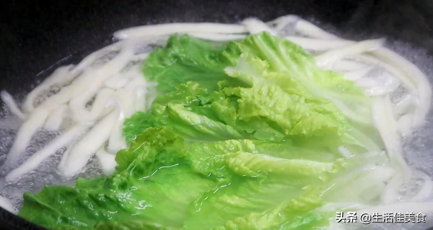 第五步:另起锅烧水,水烧开后,用削面神器进行削面,下入锅中,大火烧开,再加入自己喜欢吃生菜煮一下。