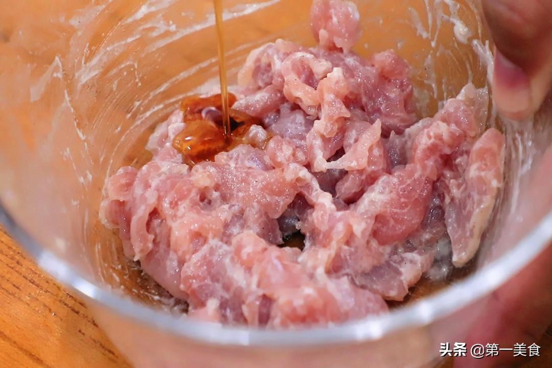 5.挤干肉片中的水分,放在碗中腌制,加入适量的料酒,大概10克就可以了,主要是增香去腥;加入1克的胡椒粉、加入1克的精盐,为肉片入一下底味,抓拌至料汁全部吸干,再次加入少量的水分,也是搅拌至全部吸收。加入少许的淀粉,搅匀以后加入少量的花生油,淀粉和花生油能保持肉丝中的水分不流失,达到嫩肉的目的 ,然后腌制1个小时。