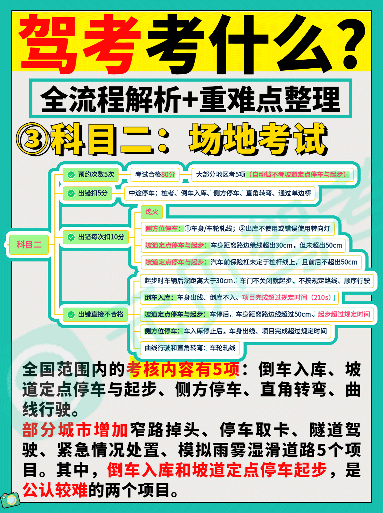 4、科目二:考试内容通常是倒车入库、坡道定点停车和起步、侧方停车、曲线行驶、直角转弯等;