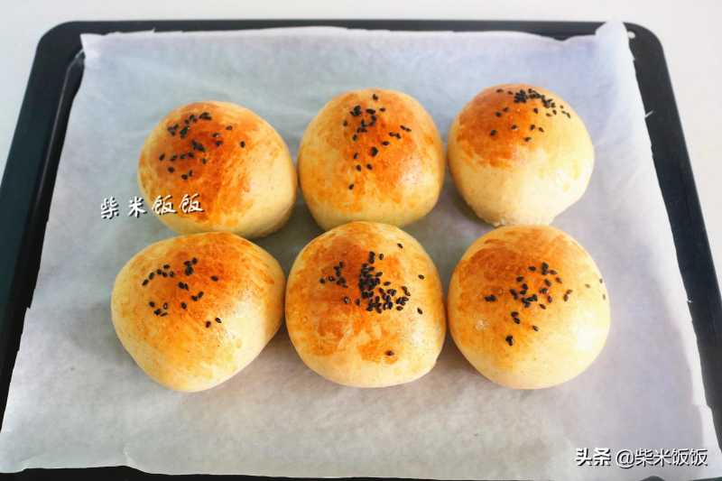 7,面包坯二次醒发好后,在表面刷上一层蛋黄液,撒些黑芝麻。然后放入烤箱,上下火170度烤20分钟。