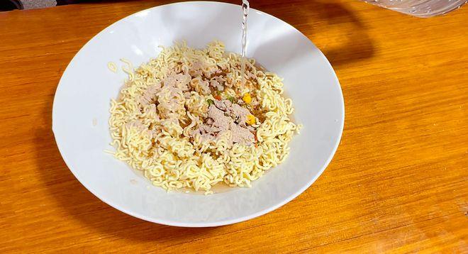 做法:1、方便面捏碎,再用工具将面块压得更碎一点,再把菜包和粉包倒入调味,倒入适量的水将方便面泡软,搅拌搅拌。