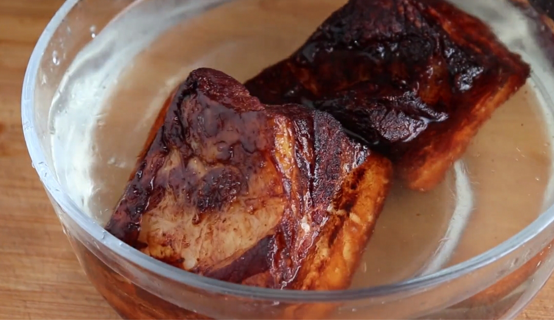 7.然后再把猪肉翻过来,六面都炸至金黄。炸至金黄后直接放在冷水锅中浸泡两小时。要想做出来的猪肉表皮呈虎皮状。一定要记得放在冷水锅中浸泡哦。