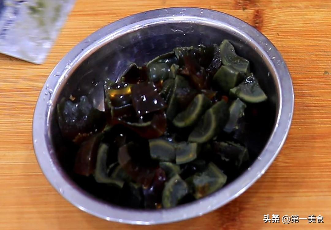 准备适量的熟皮蛋,剥掉外壳,切成均匀的小块。