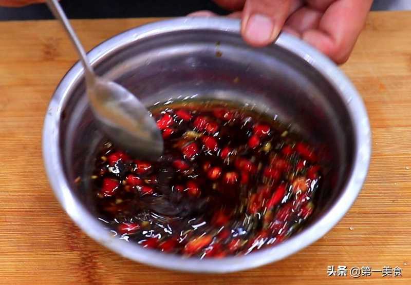 和小米椒放在一起,加入适量的鸡精、白糖、生抽、香油、香醋,再倒入一点凉开水搅拌均匀备用。