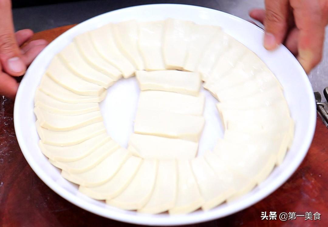 准备嫩豆腐一块,清洗干净切成豆腐片,均匀地码放在盘子里面,放入蒸锅中蒸10分钟。